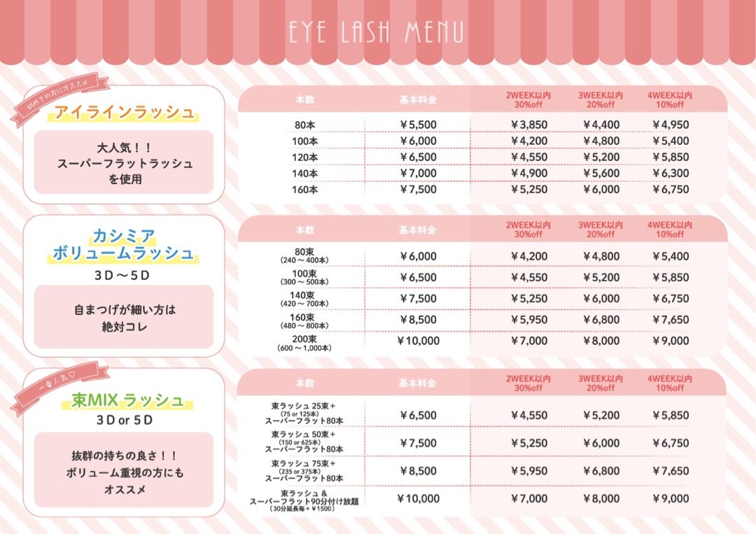 メニュー&料金神戸でまつげエクステするなら灘、摩耶駅近くのサロンドシェリー神戸。
