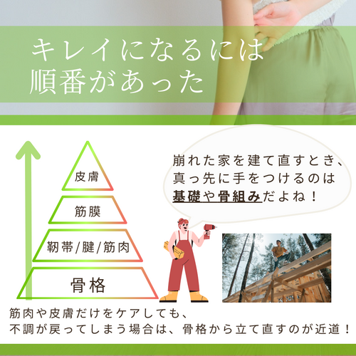 骨格ベクトルトレーニング 〗 骨格ベクトルトレーニングとは?? 骨格構造が崩れた状態での 筋トレやストレッチは 建物に例えると骨組み=骨格外壁=筋肉 どんなに外装 筋肉 を綺麗にしても 土台の骨組み 骨格 が しっかりしていなければ すぐに崩れてしまいます。