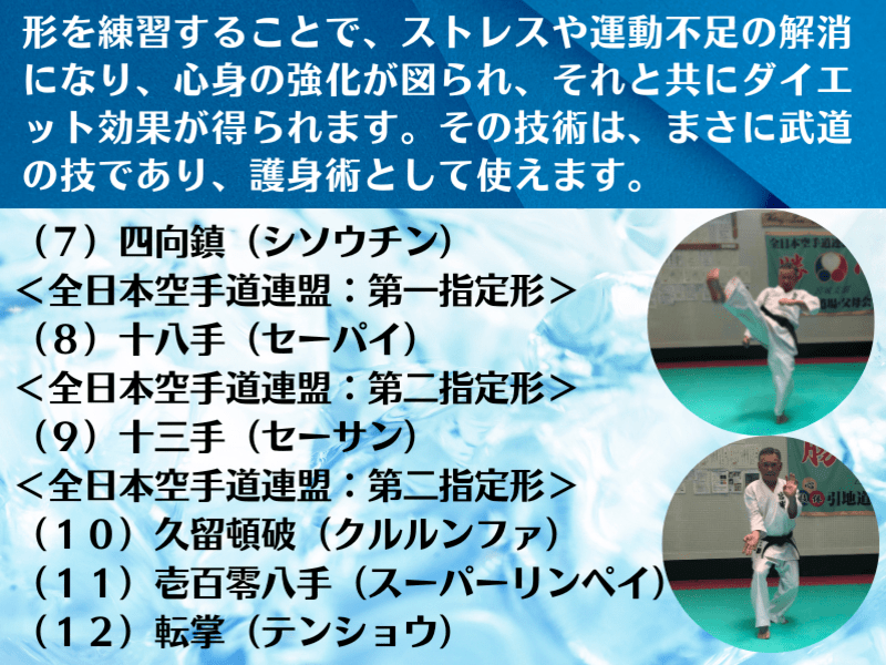 剛柔流100年の伝統空手道の12の形から希望する1つの形を解説指導引地 東一郎。
