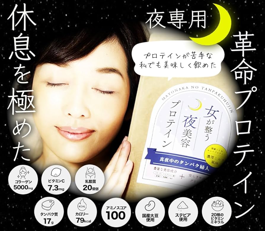 Amazon夜用プロテイン 真夜中のタンパク婦人 国内ソイ&ホエイWプロテイン 20種のビタミンミネラル ステビア使用 美味しい濃厚ミルク風味300gノーブランド品ソイプロテイン。