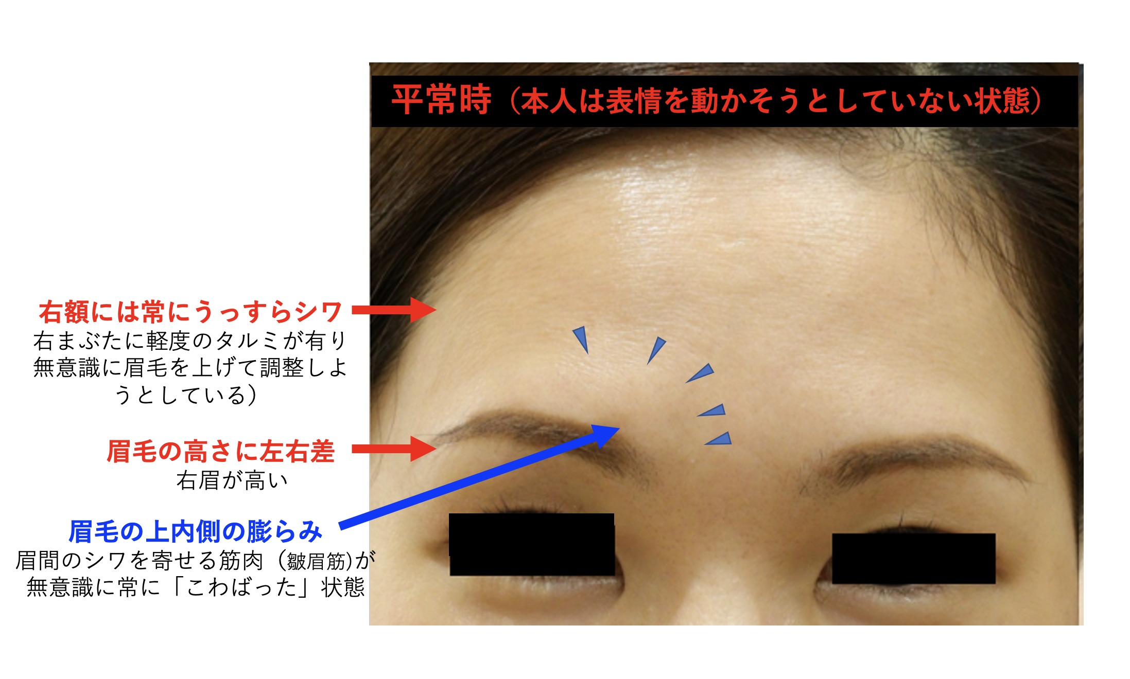眉間と額に刻まれるシワから、ご本人も気づいていない表情筋の動きを思いながら ボトックスを打ってゐる。西田美穂のボトックスマニア。