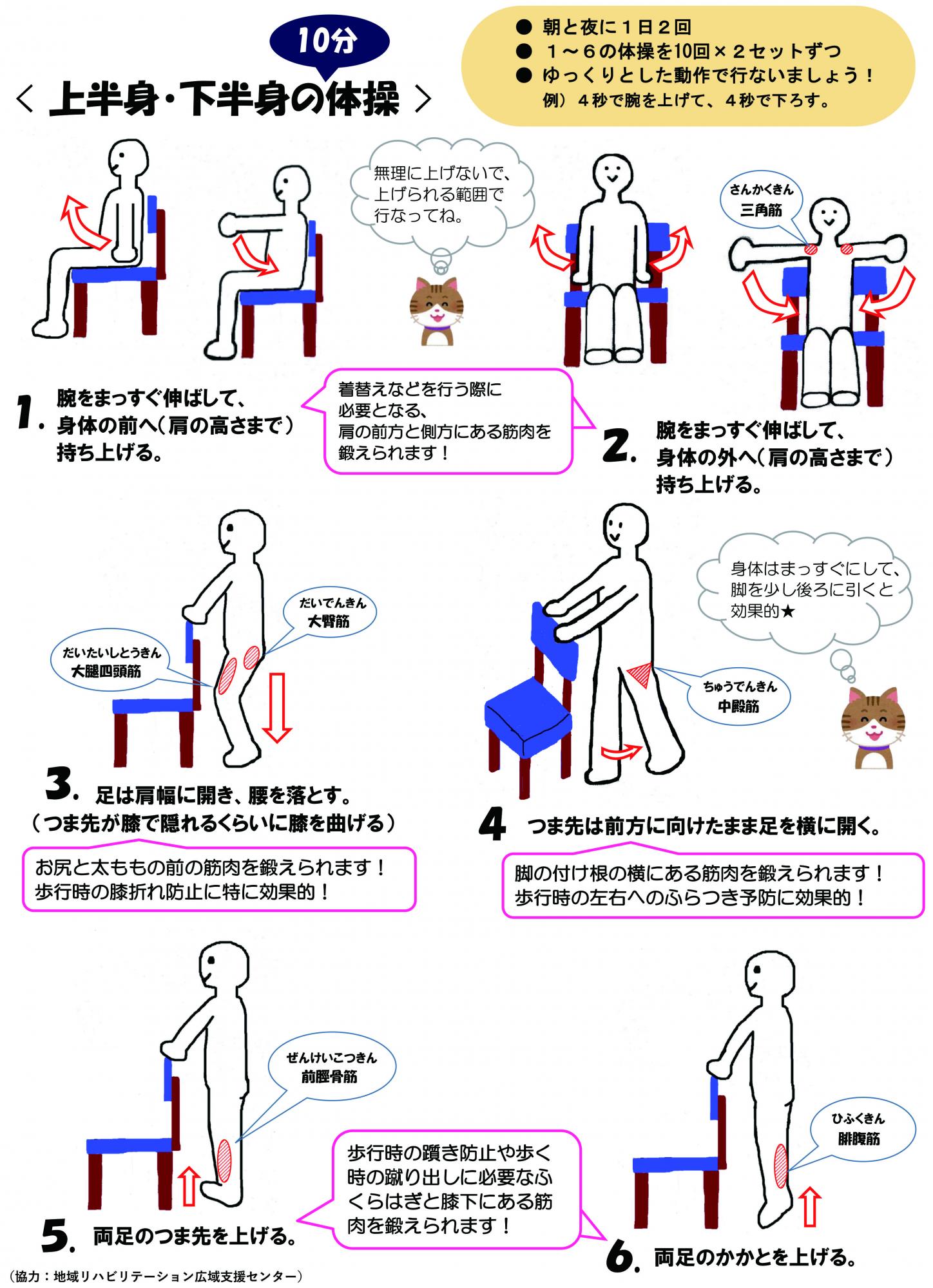 介護予防に自宅で毎日体操!その2今日は、自宅でひとりでもできる介護予防体操 その2 を紹介します!今回は歩く力を維持し高めるために、下半身をしっかり鍛える筋肉トレーニングです。野田市公式動画チャンネルでチェックしてくださいね。 でも、無理はしないで。