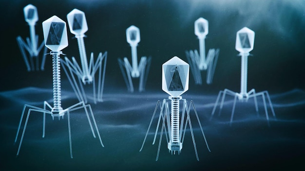 バクテリオファージ ウイルス 3 D レンダリング バクテリオファージ ホログラム ビュー SE への収束の図Premium写真。