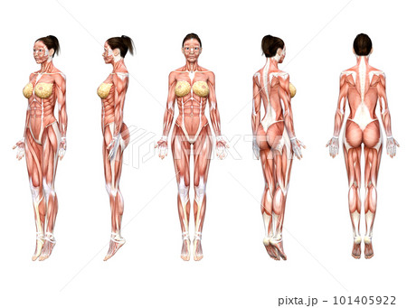 女性の筋肉解剖図 3Dモデルの全身正面 横向き 斜め前 斜め後ろ 後ろ姿のバリエーションのイラスト素材101405922- PIXTA。
