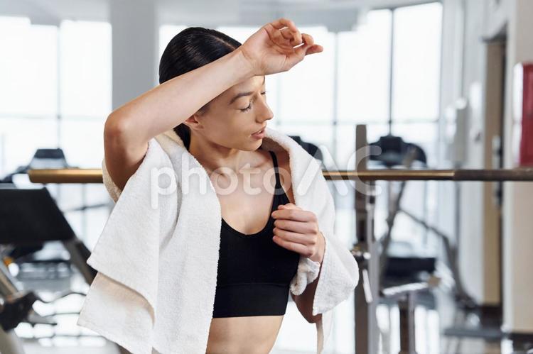 タオルをかけて腕で汗をふく女性1 - No: 24765136写真素材なら「写真AC」無料 フリー ダウンロードOK。