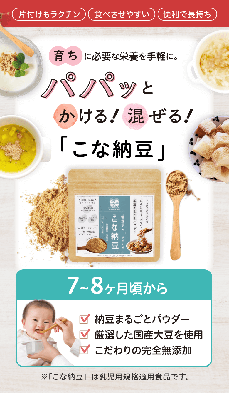 育ちに必要な栄養を手軽に! 納豆デビューならこな納豆 ネバネバ納豆を離乳食に使うと、 机も床も、顔、髪の毛、手、全身ベタベタに。 こな納豆なら粉末だから手軽に使えて便利!子供の食いつきもいいと多くのママさんパパさんから支持をいただいています。 赤ちゃんに。