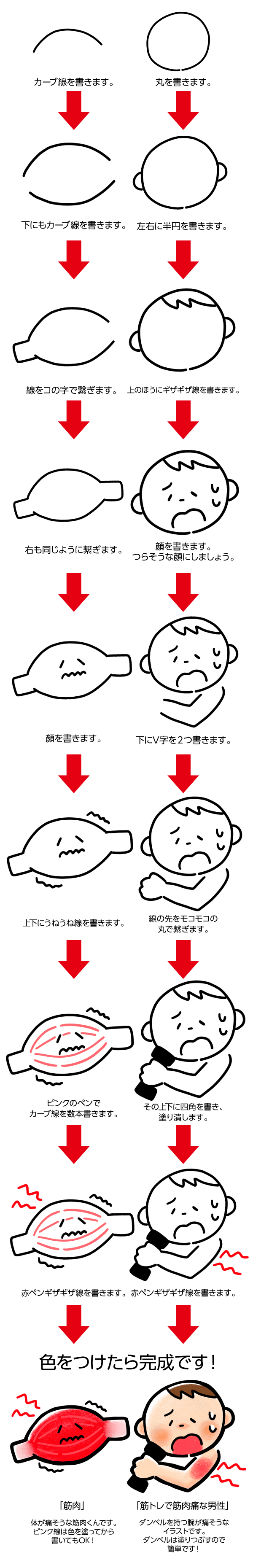 筋肉痛の手書きPOP用イラストを書こう!ドラッグストアてんとうむし。