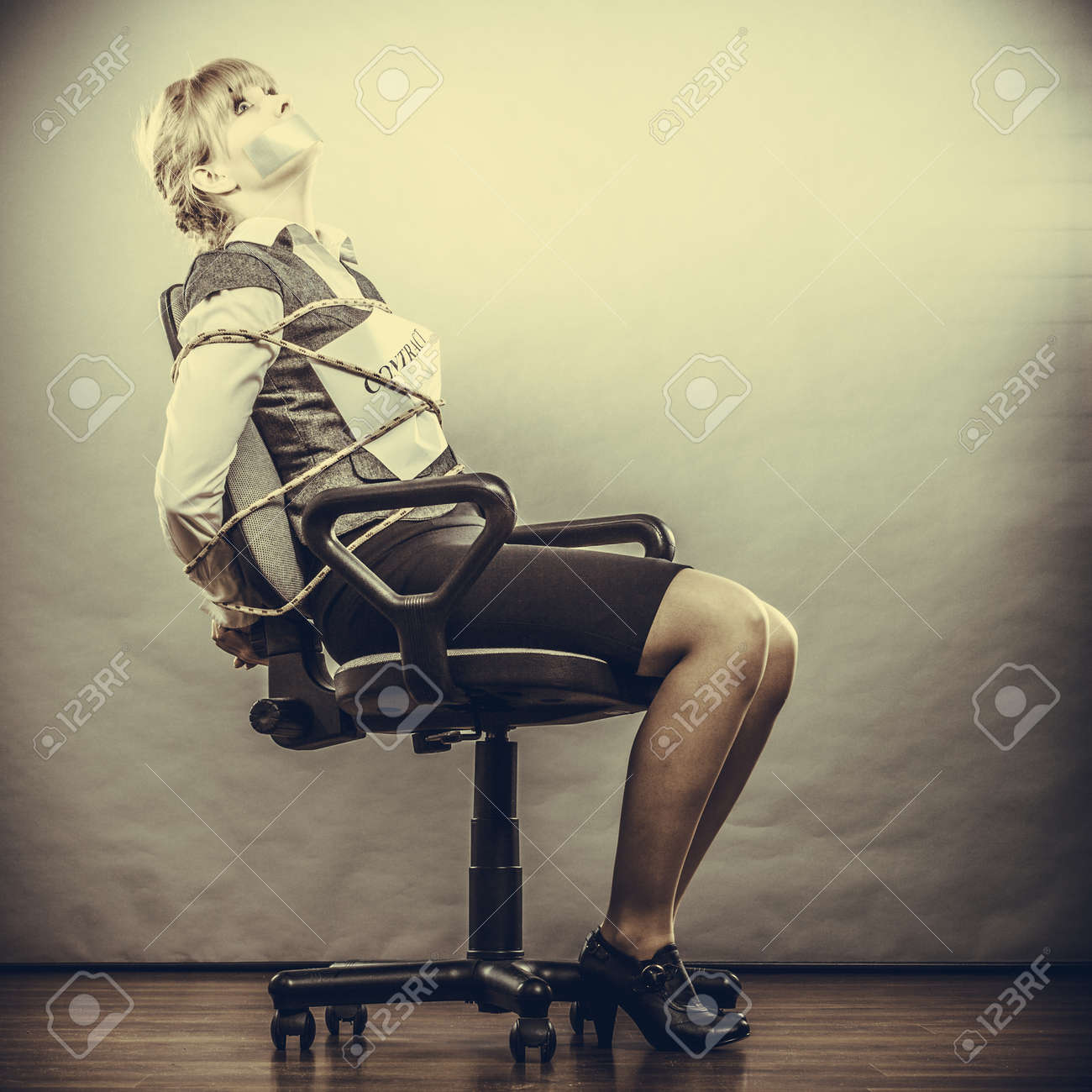実業家は、契約条項に拘束、口をテープで条件がシャット ダウンを恐れる。怖い女性が椅子になる奴隷に関連付けられます。ビジネスと法律の概念。の写真素材・画像素材Image 46279747。