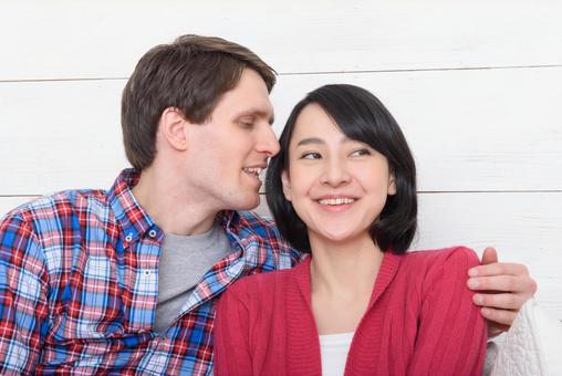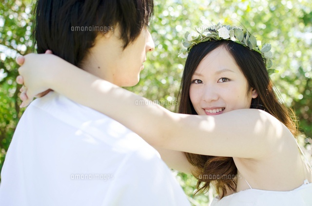 男性の肩に手を回してこちらを見る花冠を付けた女性 10568000113 の写真・イラスト素材アマナイメージズ。