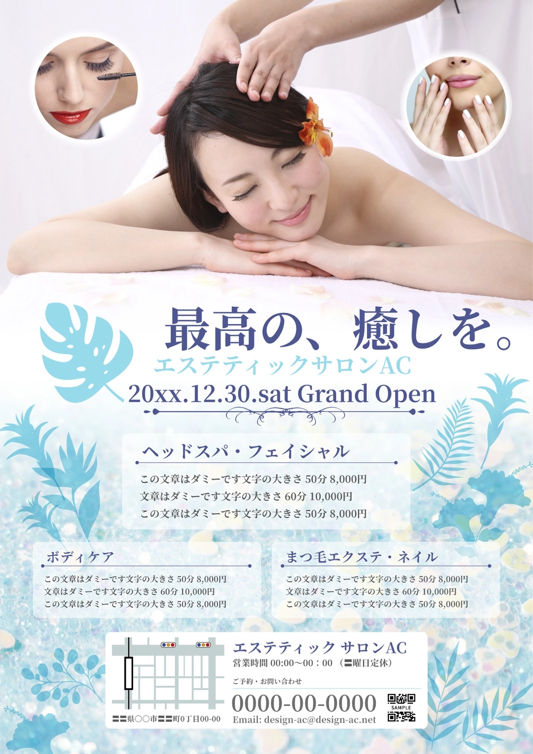 エステサロン 美容チラシデザインリラクゼーション・美容鍼灸・リフレテンプレート美容チラシリーフレット・パンフレット作成-エステ ・ネイル・クリニック・ヘアサロン。