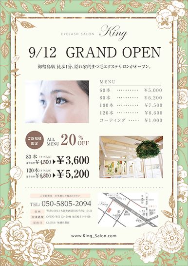無料でデザインしよう!美容室・エステサロンのチラシ・印刷物クイックデザインONLINEネット印刷通販ならキングプリンターズ。