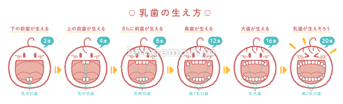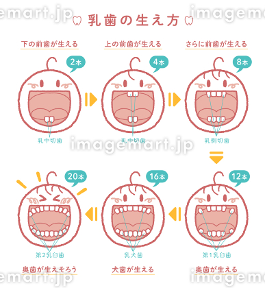 乳歯が生える過程の解説イラスト ヨコ1列、見出し+本数+歯の名称つき194233181- イメージマート。