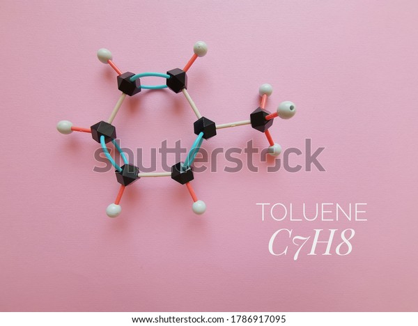 トルエン分子の分子構造モデル及び化学式。 トルエン トルオール は、芳香族炭化水素であり、刺激臭のある可燃性液体であり、有機溶剤として広く用いられている。写真素材1786917095Shutterstock。