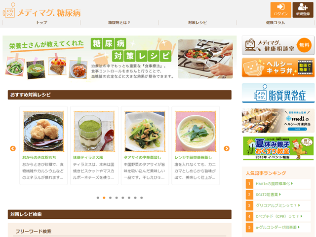 クックパッド、糖尿病患者向けのレシピサイトをリリース〜クックパッドの人気レシピを糖尿病患者向けにアレンジ、大学と共同開発の献立も提供〜クックパッド株式会社。