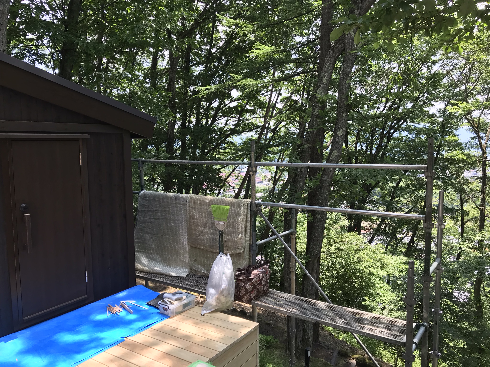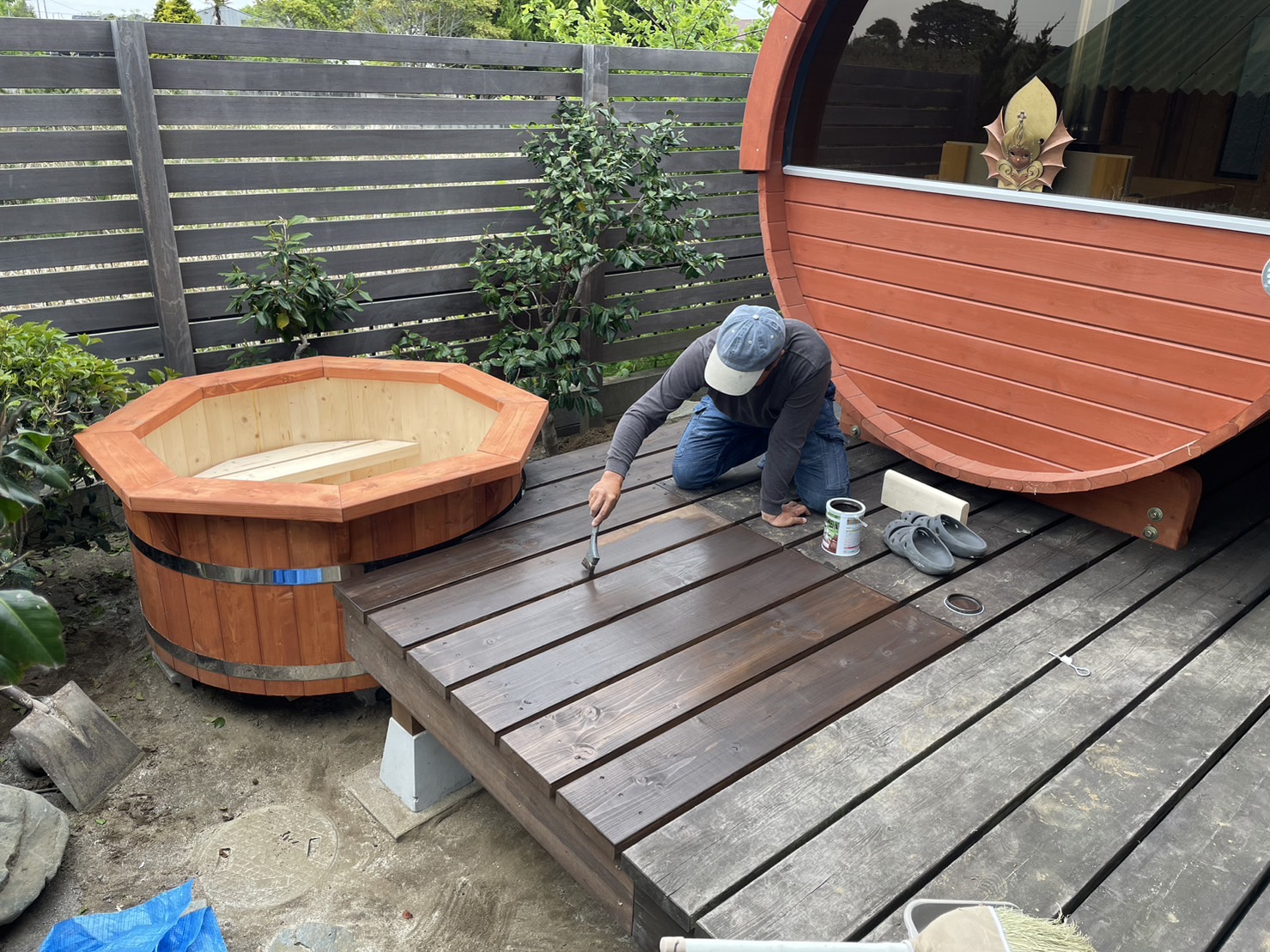 あとは草屋根つけて完成!水風呂デッキも可愛いでしょ🧖cliphouseサウナサウナ小屋sauna絶景スケルトンハットエンジョイワークスsoilwork。