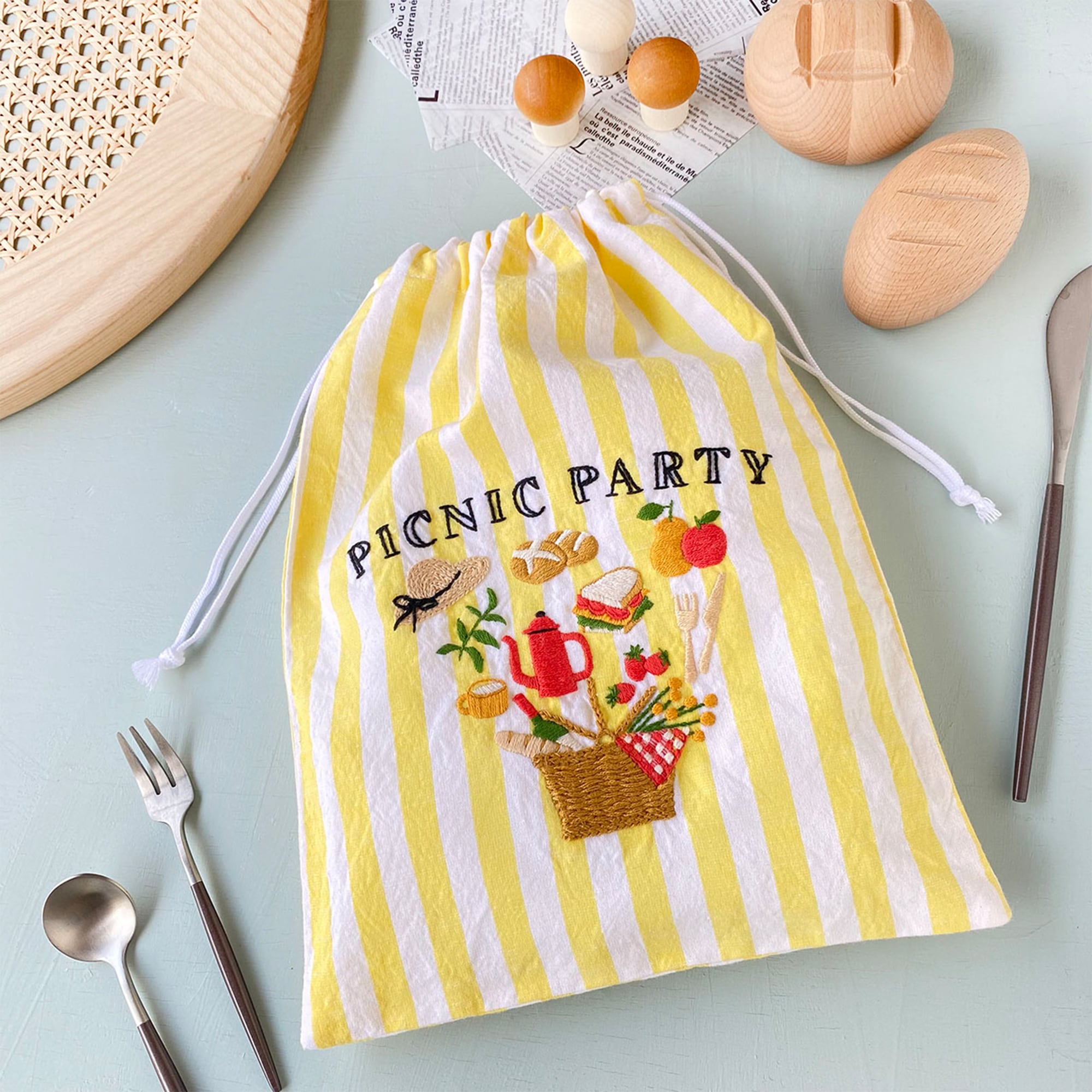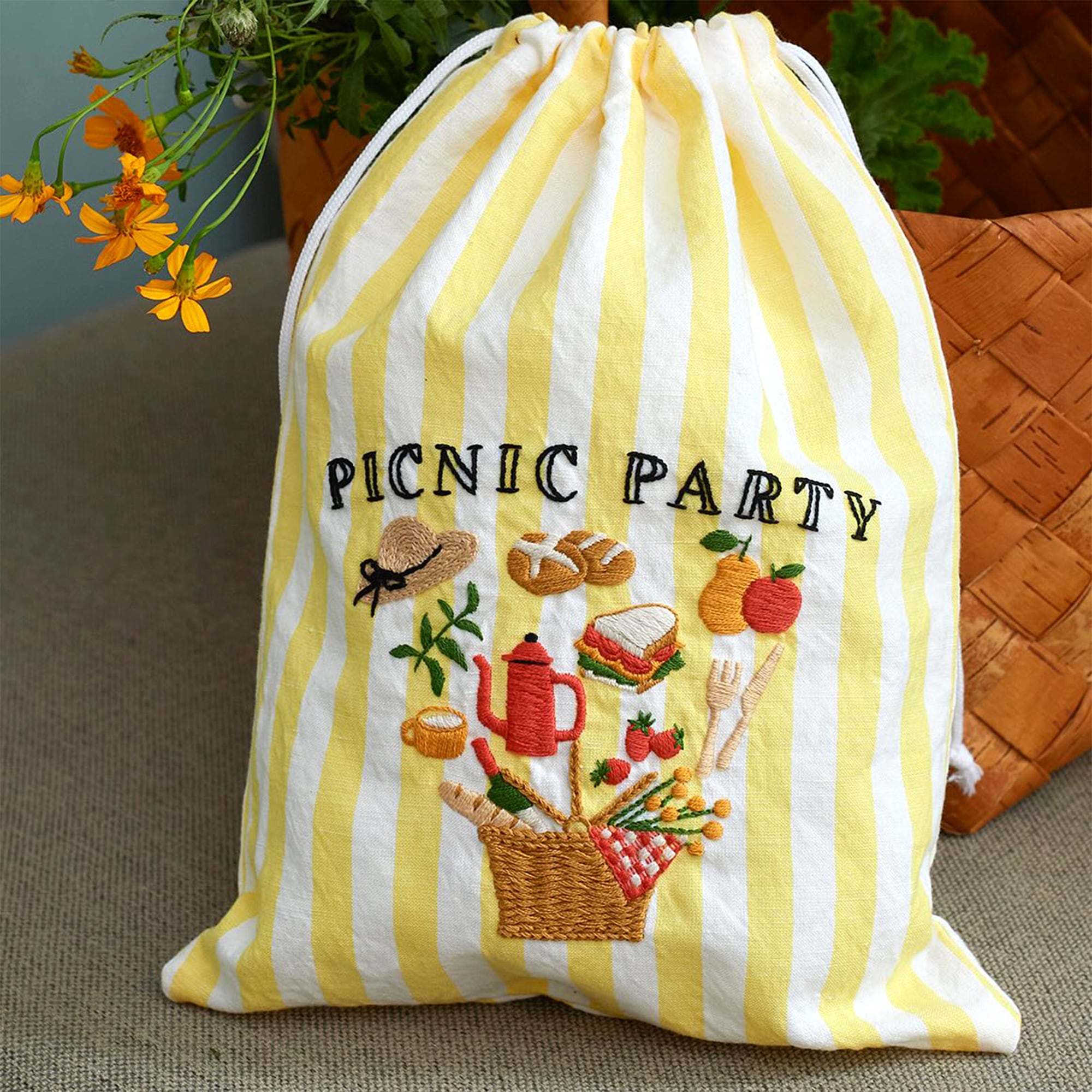 ヌビ生地♡刺繍巾着バック 生成り×合皮 りんご狩り 手作りキット≪ komihinataさま監修 刺繍入りヌビ生地で作る巾着バッグ キット≫デコレクションズオリジナル キット商品 ハンドメイド│バッグ │作り方説明書付き。