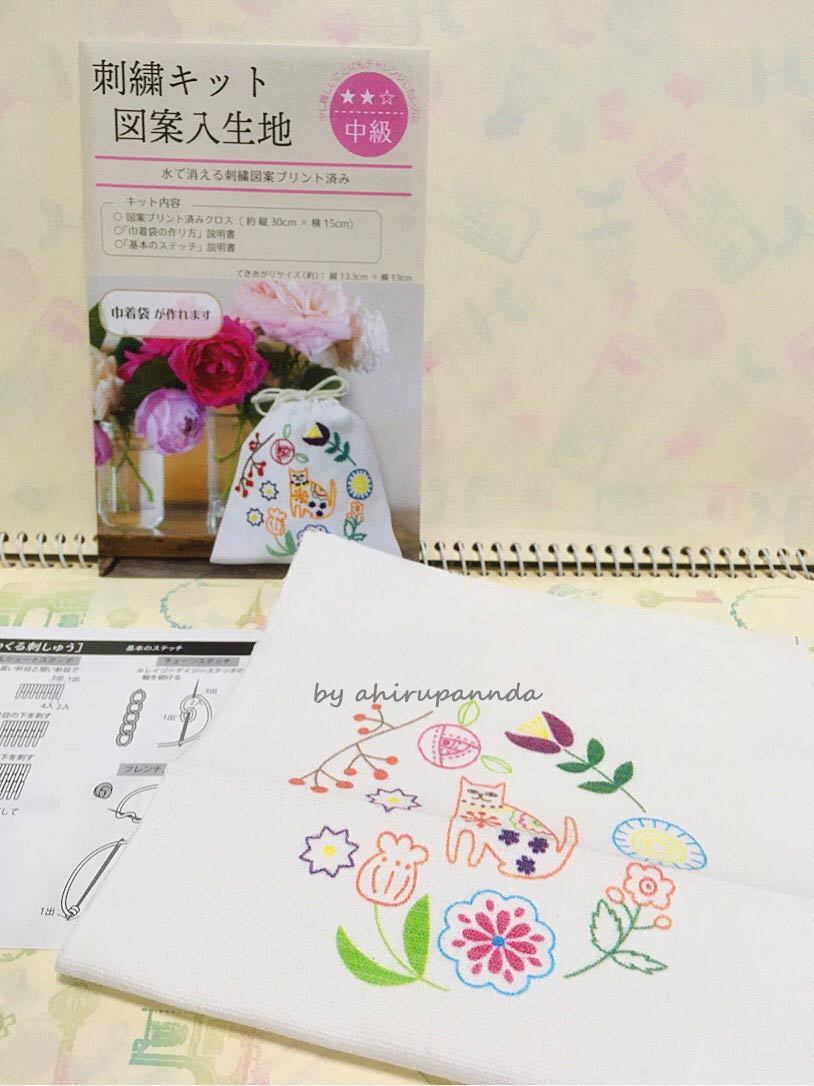 セリアで巾着になる猫の刺繍キット買いました : 作ってる時間が楽しいから。