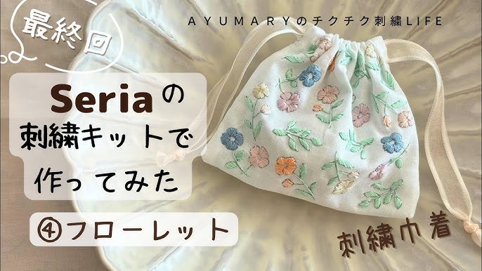 巾着シリーズ最終回・Seriaの刺繍キット ④フローレット 刺繍ポーチの作り方 セリア ハンドメイド 初心者 embroidery。
