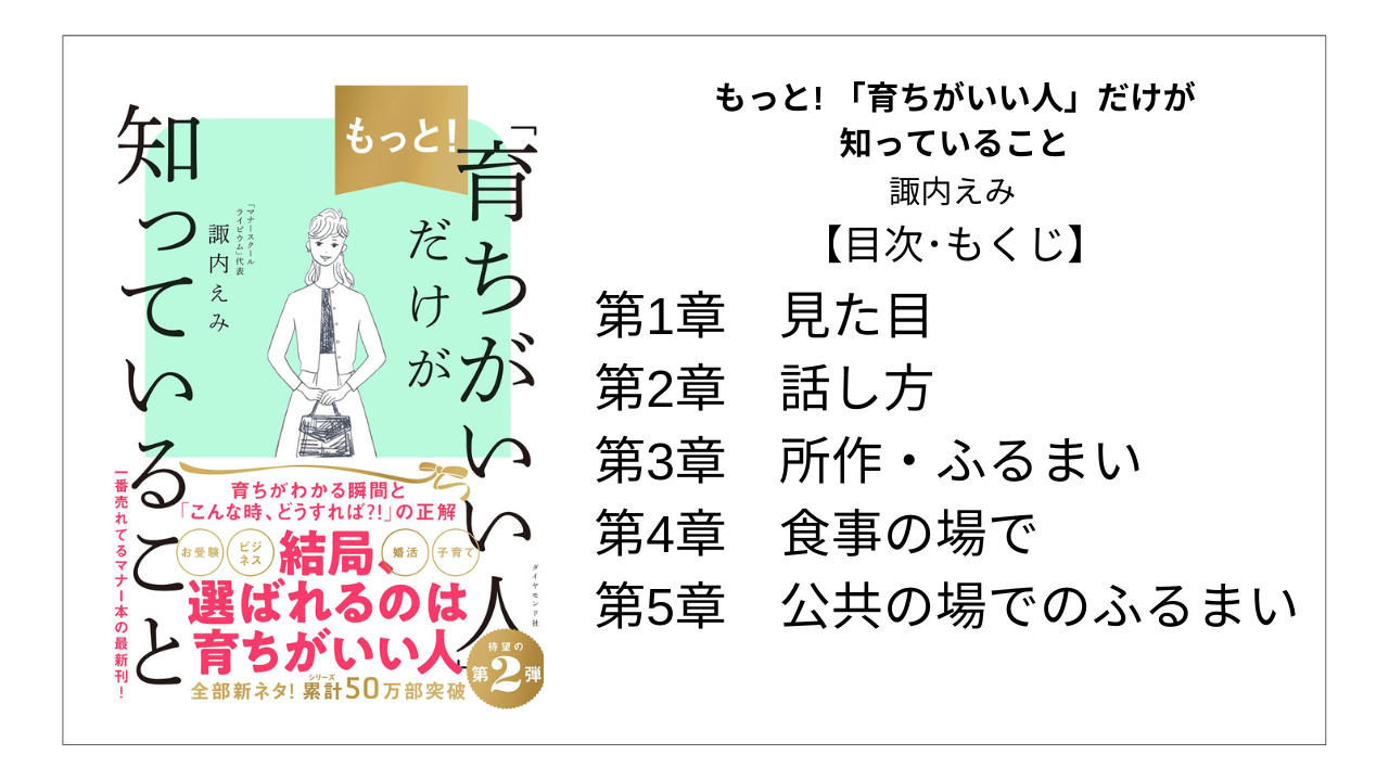 全目次 もっと! 「育ちがいい人」だけが知っていること諏内えみ 要約・もくじ・評価感想育ちがいい人だけが知っていることもっと育ちがいい人だけが知っていること諏内えみモクホン。