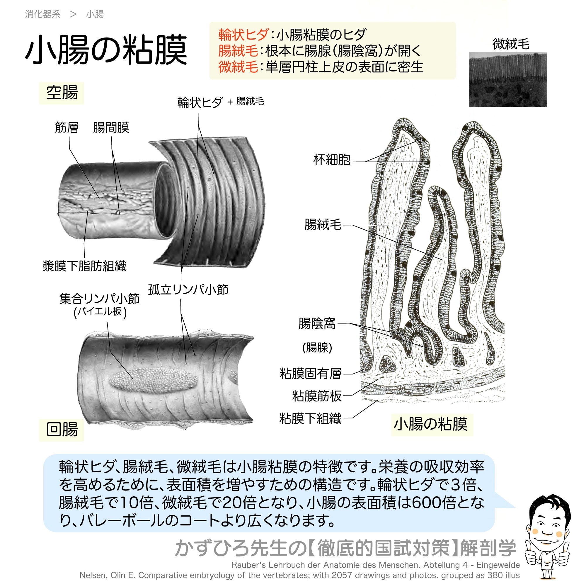 黒澤一弘 かずひろ 解剖学IT教育・指圧師・ラダック on X: " 小腸の粘膜輪状ヒダ :小腸粘膜のヒダ腸絨毛 :根本に腸腺腸陰窩が開く微絨毛 :単層円柱上皮の表面に密生 これにより小腸の表面積は600倍になります!アナトミーブートキャンプ2021。