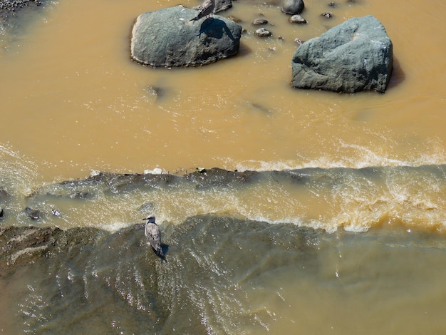 茶色の濁った水の川の急流汚れた川水の中の石嵐の川Premium写真。