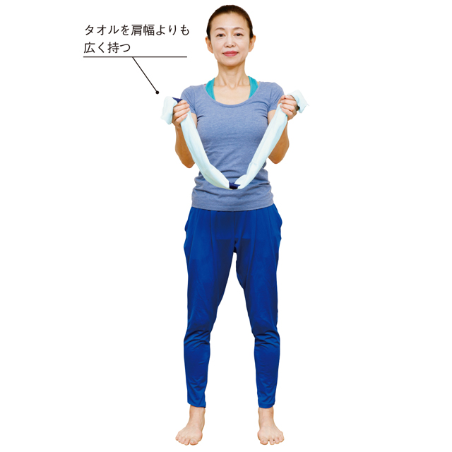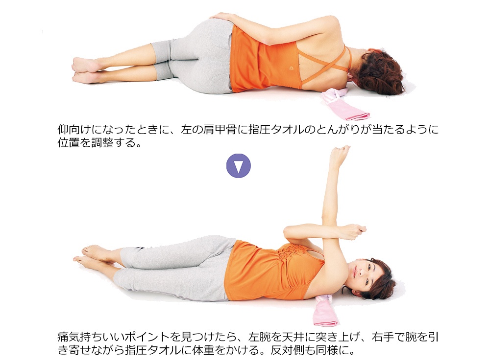 タオル1本を使って上半身の凝りを取る2ページ目 :タオル1本で寝る前リセット 骨盤ゆがみとりヨガ:日経Gooday グッデイ。