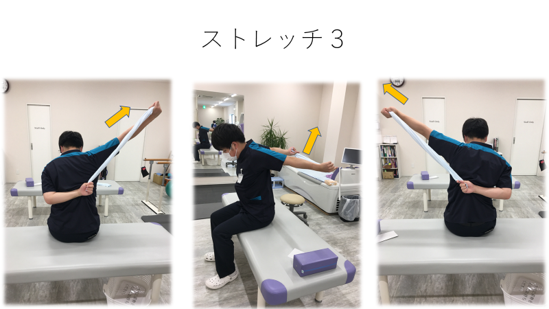 肩回しストレッチ , 1. タオルの両端を持ち、両腕を前に伸ばす。, 2. 腕を伸ばしたまま、ゆっくりと頭の上へタオルを持ち上げる。, 3.そのまま背中側までタオルを持ったまま腕を回す。, 4.前から後ろ、後ろから前へと5〜10回くらい繰り返す。,※勢いよく回さず、ゆっくりと回し、肩や背中の筋肉を刺激して肩甲骨を動かしていきましょう。,。