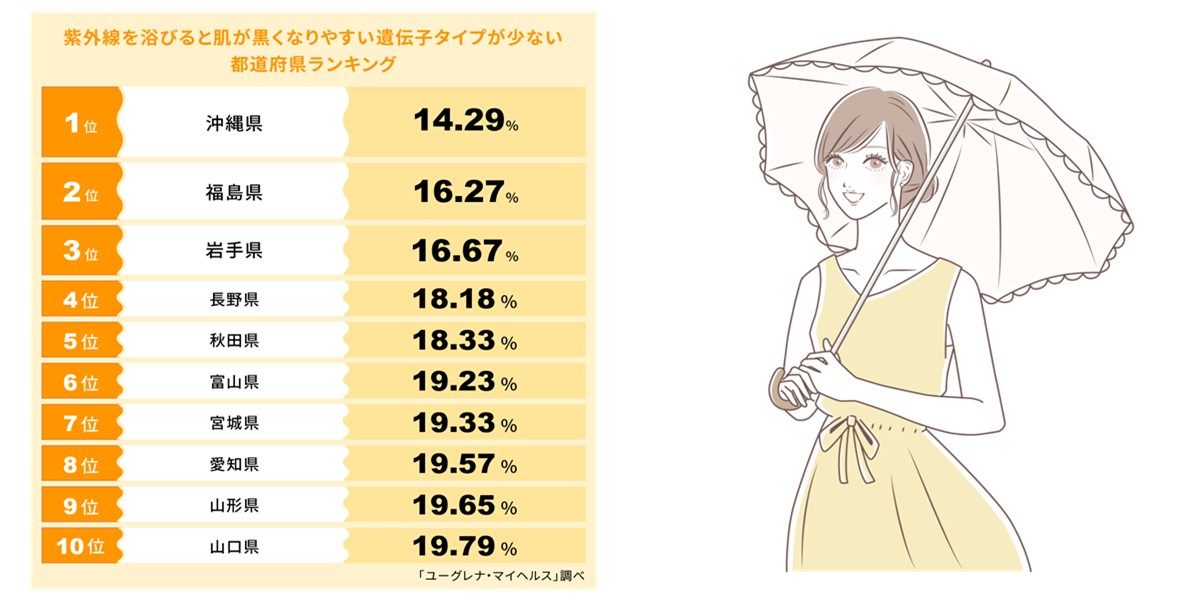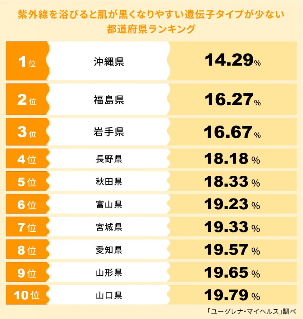 宮崎日日新聞 九州・宮崎プレスリリースSP_「紫外線を浴びると肌が黒くなりやすい遺伝子タイプが少ない都道府県ランキング発表 メラニンを作る力が弱いのは1位 沖縄県、2位 福島県、3位 岩手県」 - Miyanichi e-press。
