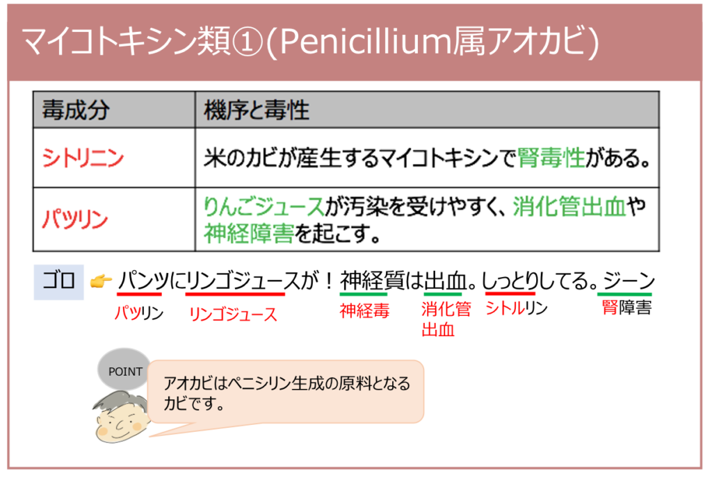 マイコトキシン類①Penicillium属アオカビ薬剤師国家試験対策学習塾YAKU BASE。