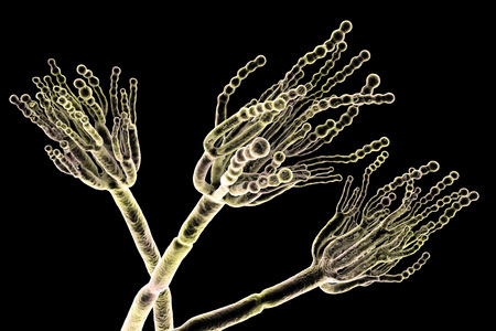 食品の損傷を引き起こし、最初の抗生物質ペニシリンの生産に使用される真菌ペニシリウムです。分生胞子と Conidiophore の胞子を示す 3 Dの図の写真素材・画像素材 Image 89447205。