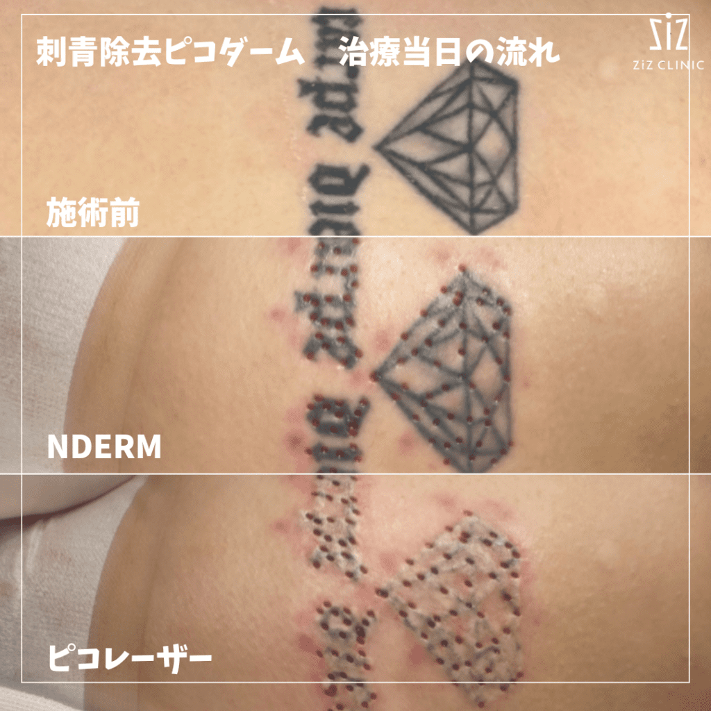 3年前に憧れの彫り師さんに複数タトゥーを入れてもらったものの、看護学生になり実習があるためタトゥーを消さないと行けなくなった患者様です👩🎓タトゥーの部分に瘢痕で凸凹があったことと、できるだけ早く消したいとのご希望でピコレーザーと、傷をなじませるピコ。