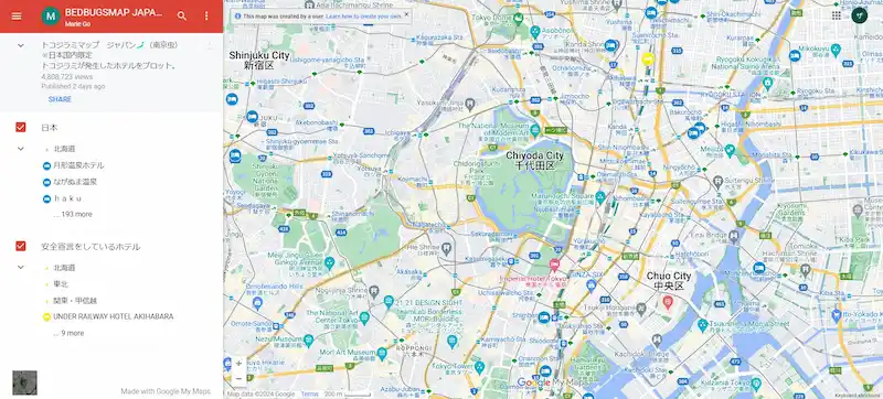 BEDBUGSMAP JAPAN トコジラミホテルマップ日本- Google My Maps。