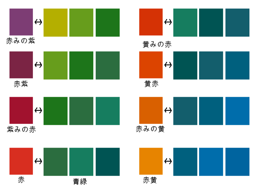 赤色・茶褐色・ピンク 赤系の色名と補色色の名前と顔料の種類,和名。