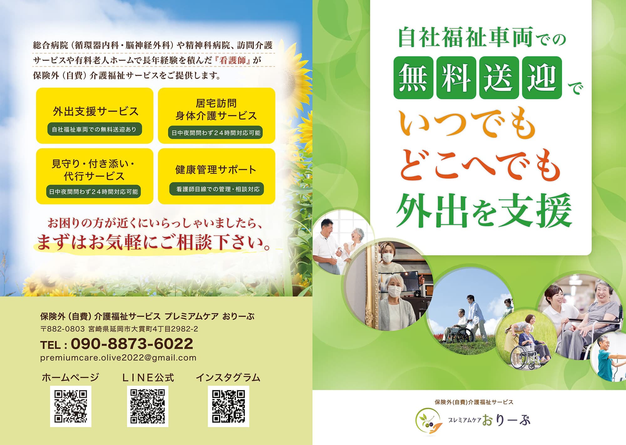プレミアムケアおりーぶ様パンフレット・看板デザイン制作で開業サポートさせていただきました合同会社micata ミカタ宮崎県延岡市。