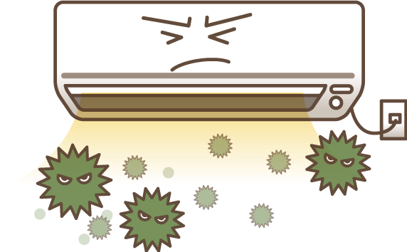 \最近、こんな症状ありませんか?🤧 , ✅ 咳が止まらない, ✅ 朝起きると喉がイガイガ, ✅ 部屋にいると何だかだるい ,もしかしたらそれ、エアコン内部のカビやホコリが原因かもしれません💦, 見えない空気の汚れを吸い続けることで、体調不良を引き起こすことも 😱,特に小さなお子様やご高齢の方、アレルギー体質の方がいるご家庭は要注意です⚠️,。