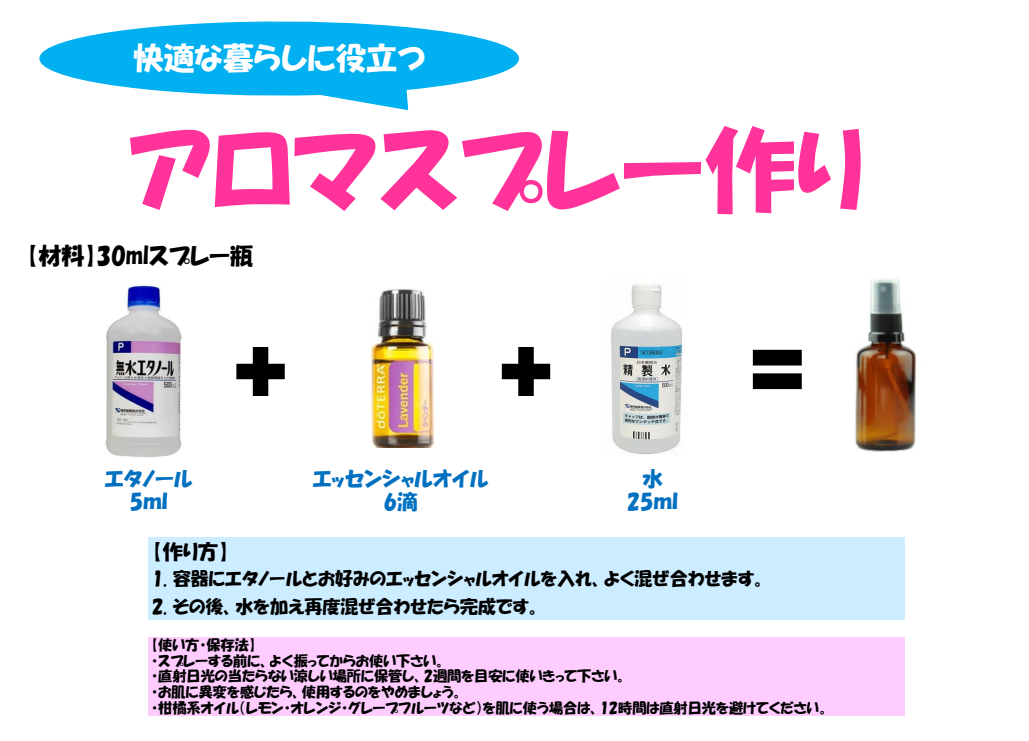 簡単!アロマスプレーの作り方・基本のレシピ基本レシピアロマと暮らすエッセンシャルオイル 精油・アロマオイル の通販ならフレーバーライフアロマと暮らす。