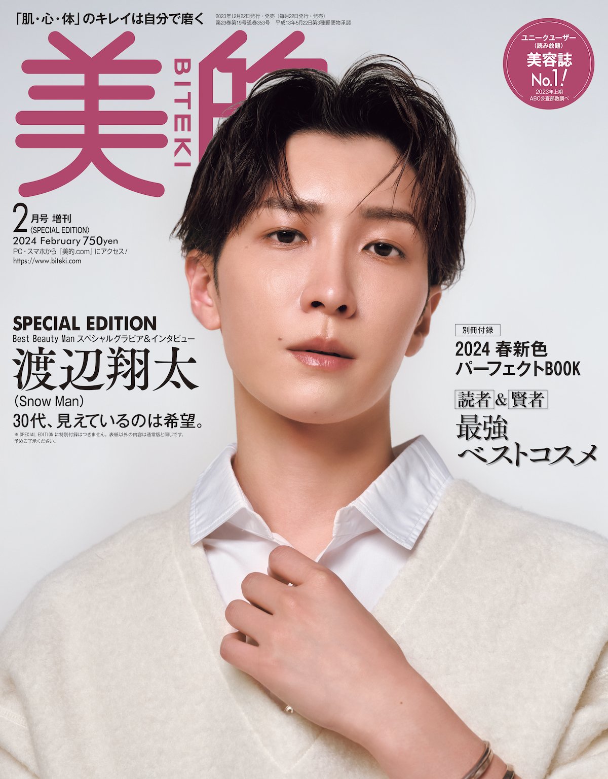 解禁 渡辺翔太さん Snow Man 表紙の『美的』2月号SPECIAL EDITIONハイライトいらずの驚異の美肌と甘い表情にキュン♡美的.com。