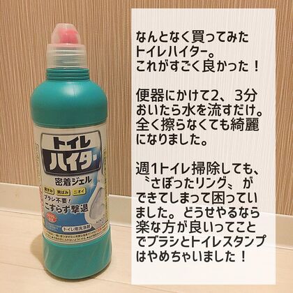 トイレを綺麗に保つ方法. トイレ掃除は トイレハイターを手に入れてから サボりまくり😂 . 週一でハイターをまわしかけておけばコツコツブラシで磨かなくても サボったリングできなくなりました👍 . トイレ掃除のハードルを下げるコツは 掃除用具はさっと手に届く場所。
