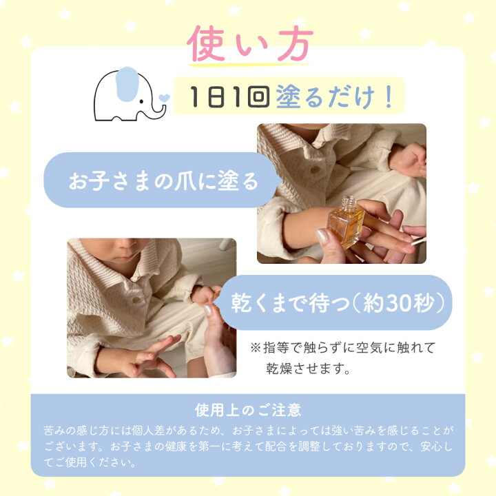 楽天市場 指しゃぶり 防止 マニキュア 10ml 爪噛み 防止 爪かみ防止 誤飲防止 武内製薬 ゾウさんのバイバイチュッチュ 子供 おしゃぶり 苦い天然由来成分配合 ネイル 速乾 指しゃぶり防止マニキュア 爪かみ 指吸い 爪噛み防止 : BEAUTY CART 楽天市場店。