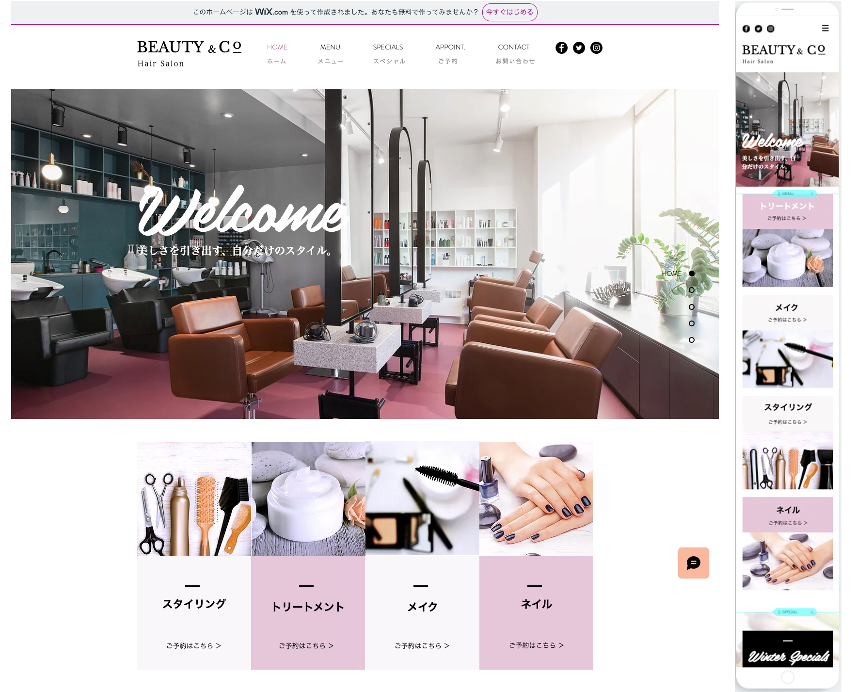 Wixでお洒落な美容室のホームページ サンプル 作成してみました。ヨシタカ@構成から提案できるLPデザイナcoconalaブログ。
