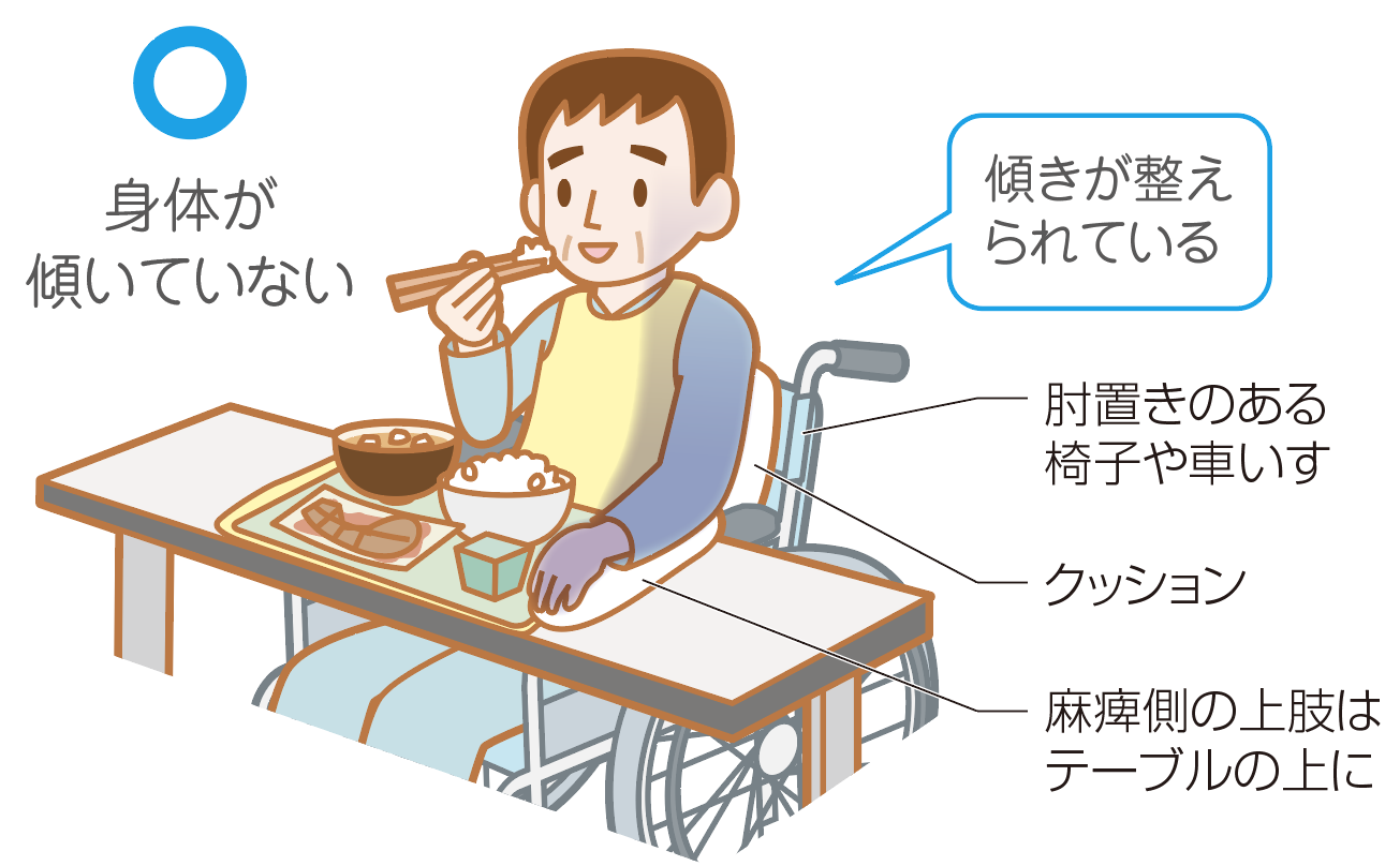 食事のポジショニング ヘッドアップ・セミファーラー位 のイラスト – すぐに使える!リハビリのイラスト集。