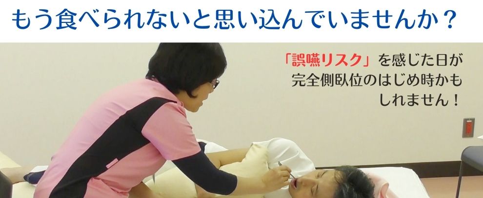 座位や背中を倒した食事姿勢で食べられない方でも、食べられる。 - 誤嚥しないで人生最後まで口から食べられる完全側臥位法。