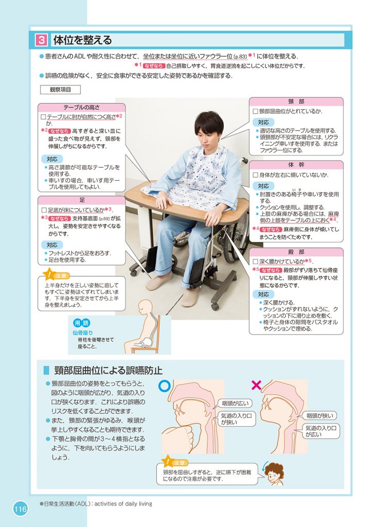 食事介助時の姿勢 行け行けミエ子!『看護がみえる』で実習対策- がんばれ看護学生! メディックメディア。