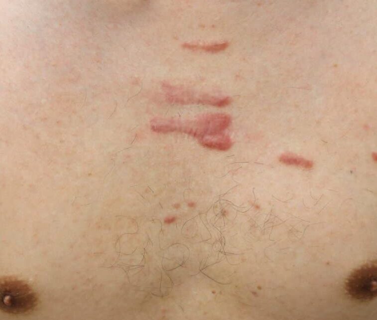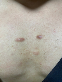 ニキビを絞った後、男性の上部胸にできた大きなケロイド傷写真素材1046380495Shutterstock。