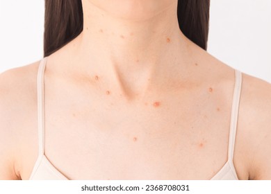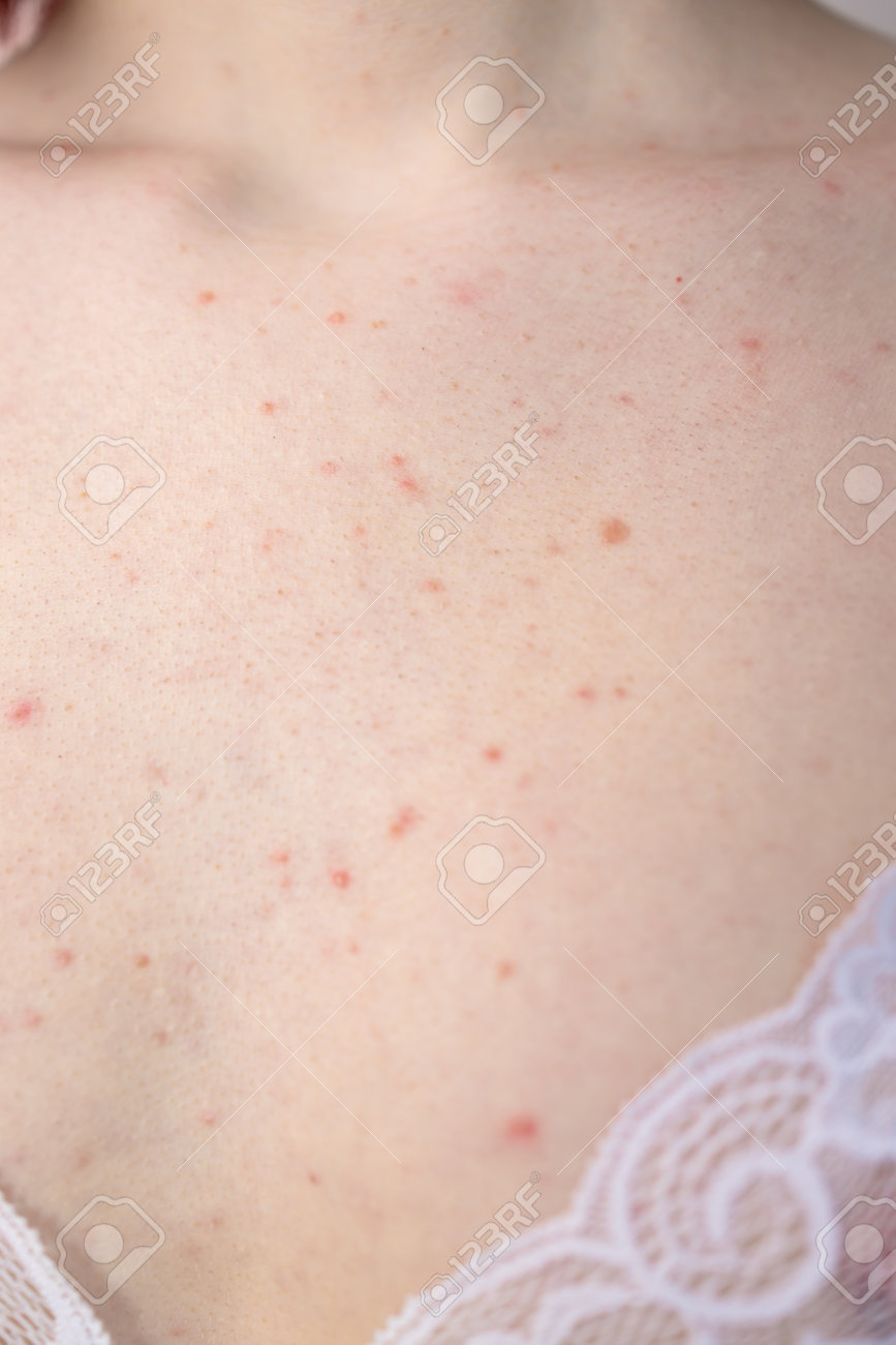 10代の少女は胸に赤い斑点がたくさんあります。にきびホルモンからの写真素材・画像素材 Image 199109867。