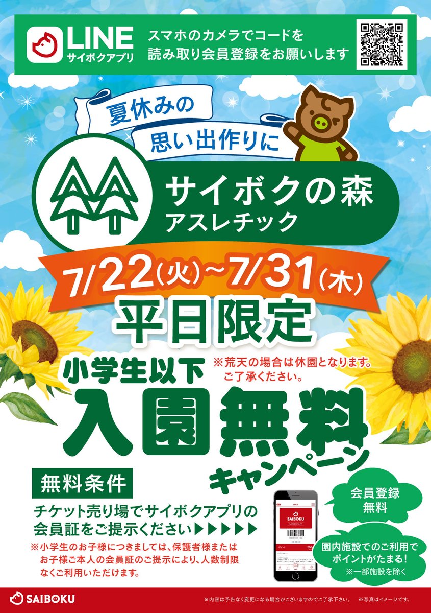 サイボク公式on X: "🧒予告👧 2025年7 22~7 31の平日限定で、サイボクの森が 🌲小学生以下入園無料🌲になります❣夏休みはサイボクで遊ぼう😆水分補給🥤を忘れずにね🐷 ⚠️荒天の場合など予告なく休園となる場合がございます。ご了承ください。https:t.co。