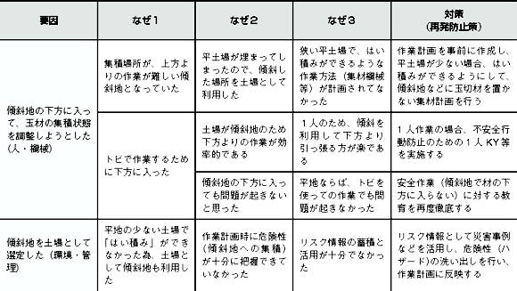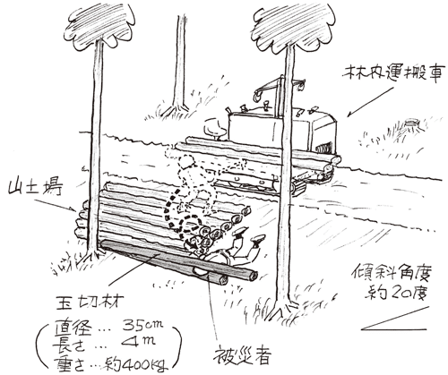 玉切材を林内運搬車より傾斜した山土場に降ろす際、転がった玉切材に挟まれる災害事例研究林業・木材製造業労働災害防止協会。