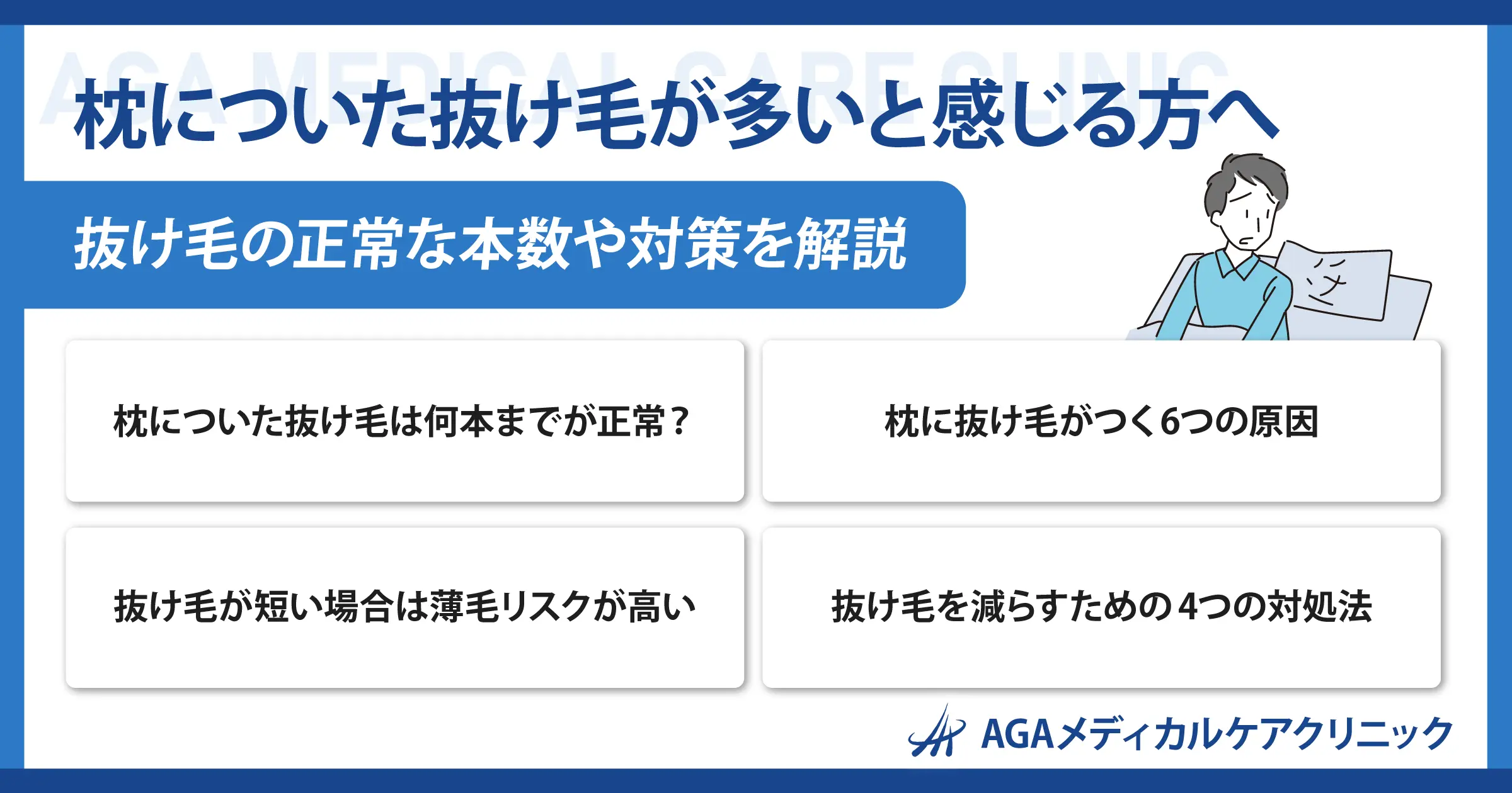 枕についた抜け毛が多いと感じる方へ。抜け毛の正常な本数や対策を解説AGA・抜け毛・薄毛治療のAGAメディカルケアクリニック 公式。
