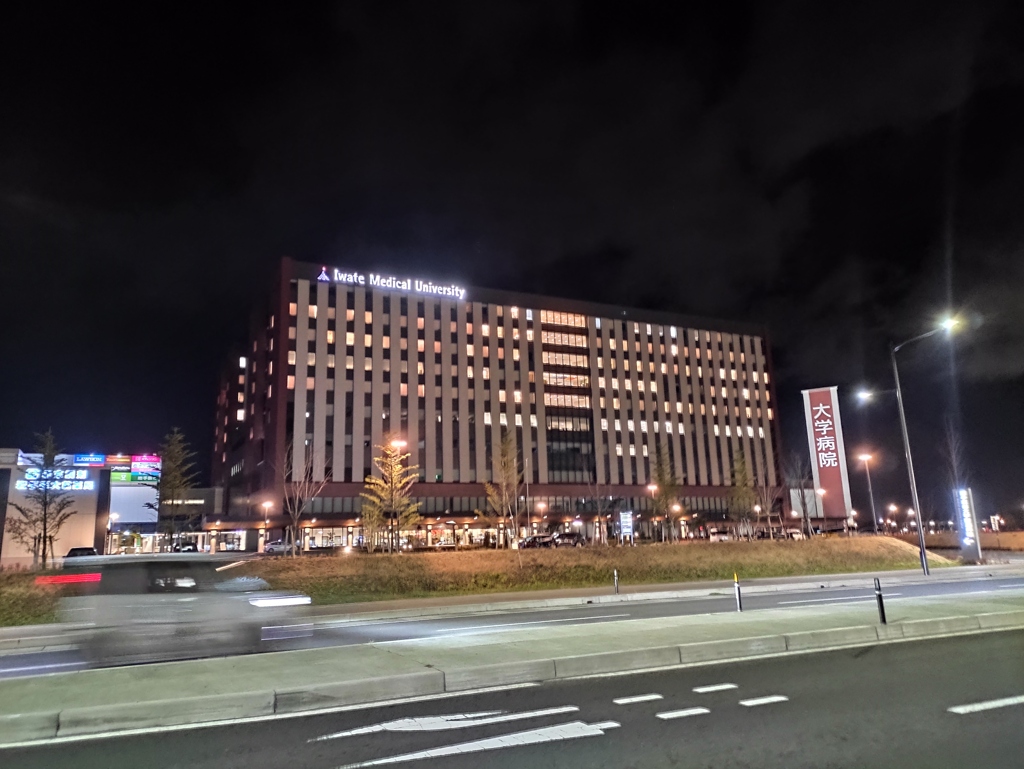 夜の岩手医科大学。 病院も校舎も最近建て替えられて、外観も中身もすごくカッコイイです。 東京⇔盛岡は新幹線で約2時間15分。盛岡駅から最寄りの矢幅駅までは13分です。 岩手医科大は想像以上に「近い」と思います。医学部予備校塾勉強垢受験入試合格。