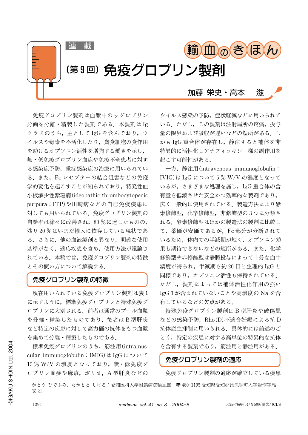 免疫グロブリン製剤medicina 41巻8号医書.jp。